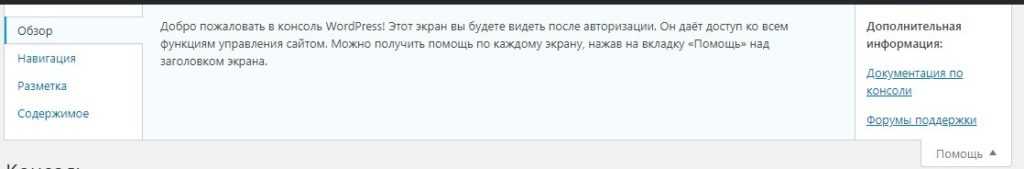 Наконец, вкладка «Помощь» предоставляет информацию о поддержке на страницах администрирования.