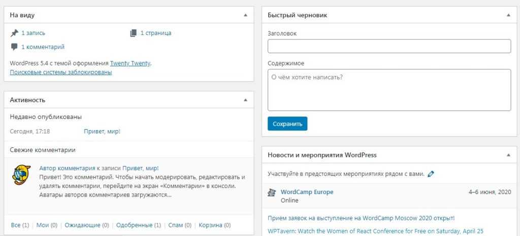 | На виду | Он предлагает краткую информацию о содержании сайта, разделенную на посты, страницы и комментарии. Текущая версия WordPress и название активной темы указаны в нижней части окна. |