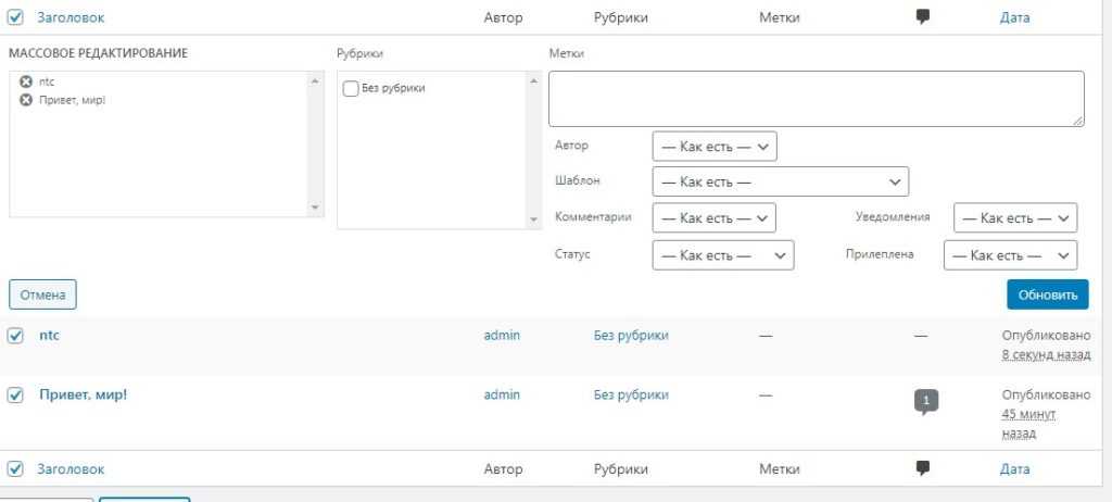 Интересной особенностью является «Групповые действия», которая позволяет изменять некоторые данные статей, такие как категории, теги, автор, статус, формат и другие данные.