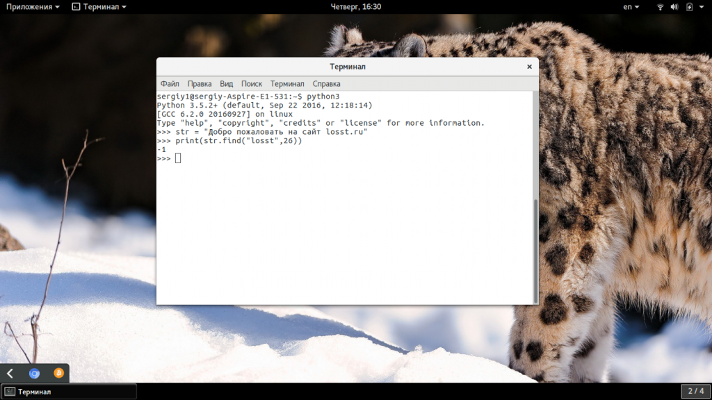 Этот метод выводит позицию первого вхождения подстроки losst.ru если она будет найдена, если ничего не найдено, то возвращается значение -1. Функция начинает поиск с первого символа, но вы можете начать с энного, например, 26: