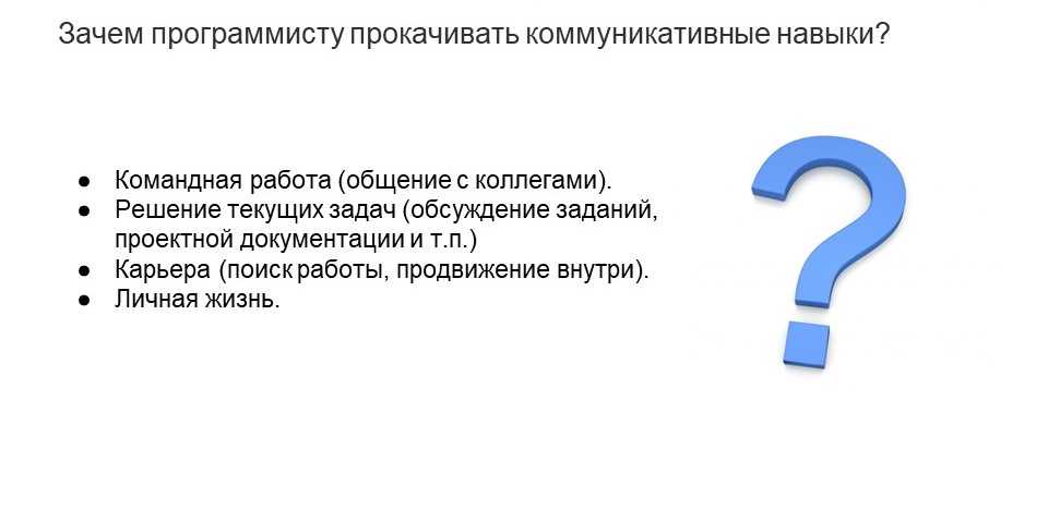 Конечно же, для карьеры. Можно ведь быть гениальным программистом, но сидеть в замкнутом пространстве, где никто о тебе не узнает. Чтобы понравиться потенциальным работодателям, нужно развивать коммуникационные навыки.