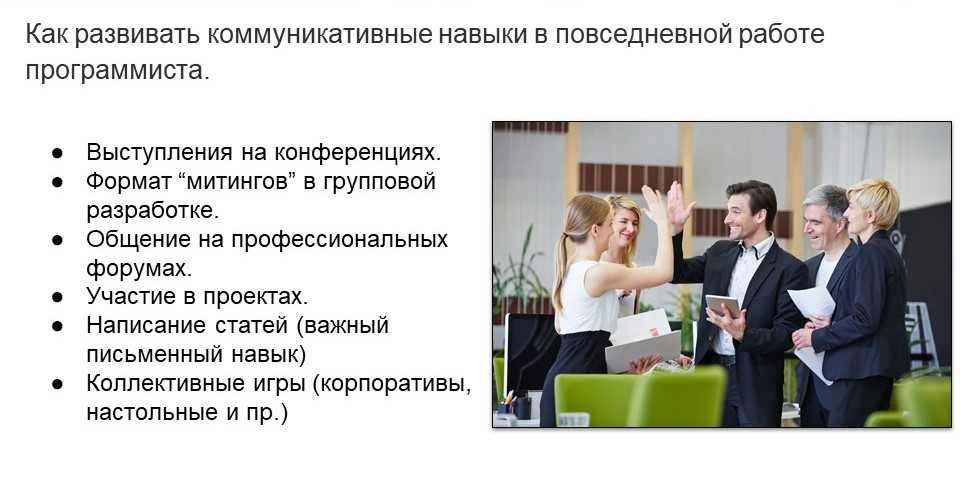 Участие в проектах. Когда программист выходит во внешний мир и начинает общаться напрямую, в том числе и с пользователями. При таком общении во всей красе здесь можно прокачать коммуникации.