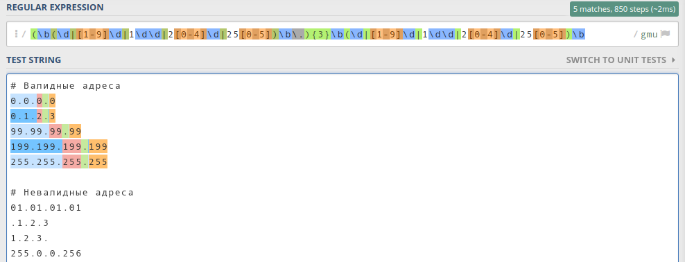 Валидный адрес должен содержать четыре числа (байта) от 0 до 255. Если он содержит число больше 255, это уже ошибка. Если бы мы делали валидацию на каком-либо языке программирования, то можно было бы разбить выражение на четыре части и проверить каждое число отдельно. Но регулярные выражения не поддерживают проверки больше или меньше, поэтому придётся делать по-другому.