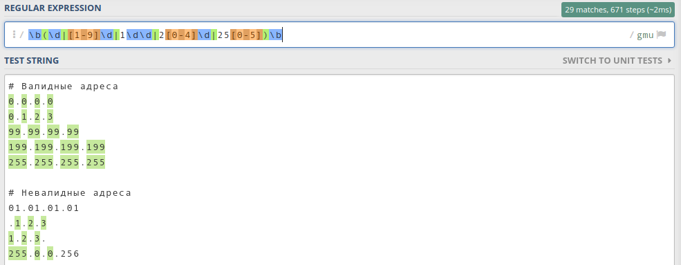 Обратите внимание, что я использовал границу слова \b, чтобы искать полные байты. Пробуем регулярку в деле: