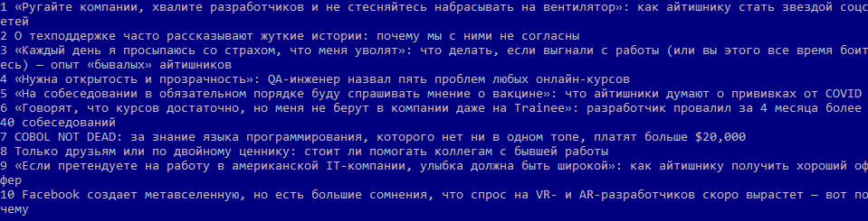 Запустив этот скрипт на исполнение, получим список заголовков: