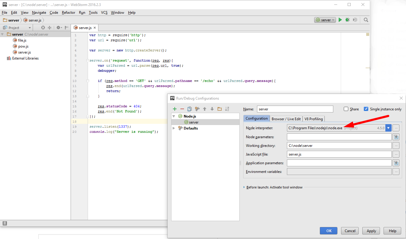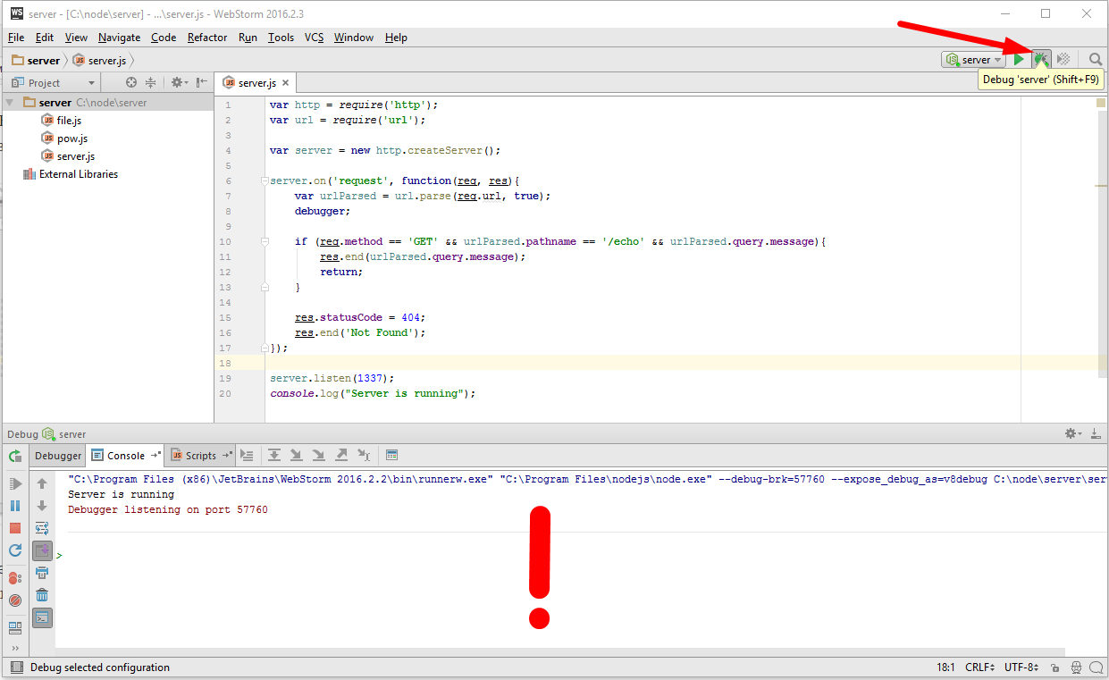 И смотрю в консоле, что у меня получилось. При запуске в режиме отладки, WebStorm добавляет к Node соответствующий параметр «—debug-brk» и указывает ему значение, это значение это порт на котором нода должна ожидать подключение отладчика, по умолчанию — 5858. Ранее к этому порту подключался node-inspector, но сейчас к этому порту подключен сам WebStorm. Соответственно он реализует необходимый интерфейс и сейчас если я зайду в браузере на этот url — «http://127.0.0.1:1337/echo?message=TEST» и перейдем в окно WebStorm, то увидим