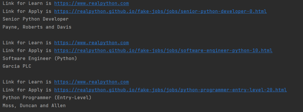 forjob_title inpython_jobs parent=job_title.parent company_element=parent.find(«h3″,class_=»company») card_parent=parent.parent.parent.parent card_footer=card_parent.find(«footer»,class_=»card-footer») card_links=card_footer.find_all(«a») forlink incard_links link_url=link»href» link_text=link.text.strip() print(f»Link for {link_text} is {link_url}») print(job_title.text.strip()) print(company_element.text.strip()) print() |