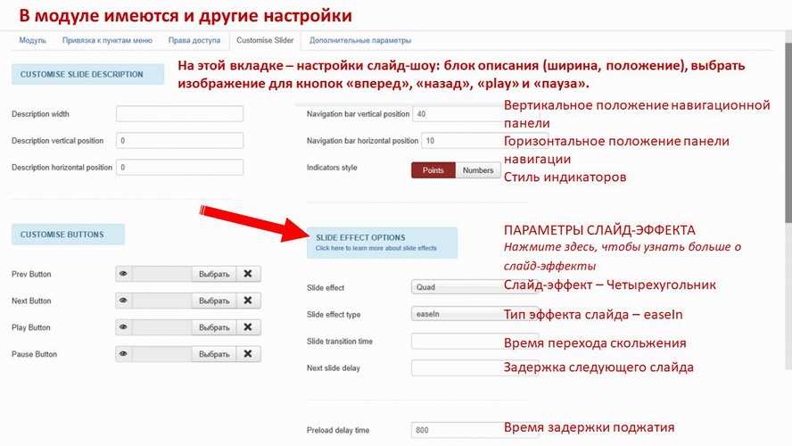 - Расширенные настройки для навигации. Можно задавать тип стрелок и переключателей, возможность переключения слфйдов с клавиатуры или колёсиком мышки, поддержка управления с сенсорных экранов и т.д.