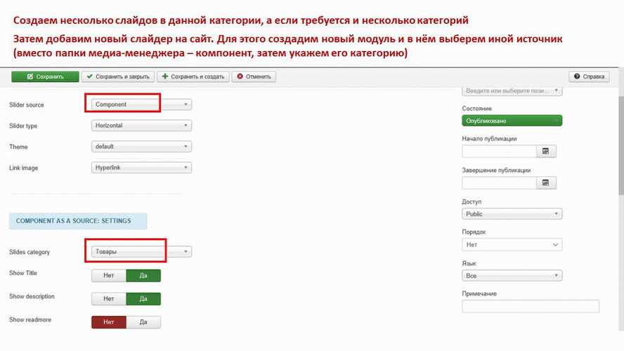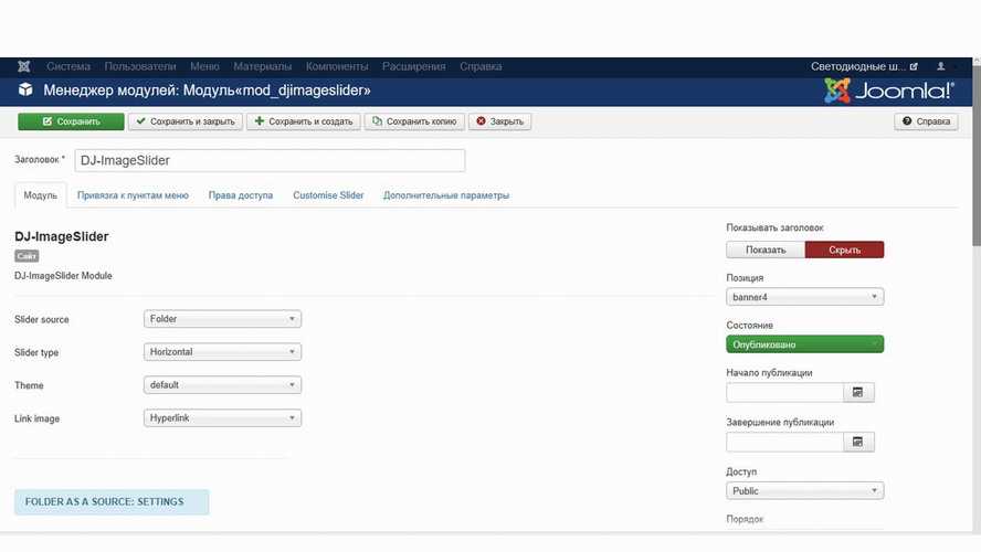 - значительно экономить время: не нужно обрезать, подгонять под один размер все картинки, модуль сделает это за вас; всего в два клика. Если нужно показать зрителю больше – дополнительные настройки имеются в компоненте расширения. Чтобы подробнее познакомиться с возможностями, советуем изучить официальную документацию: https://dj-extensions.com/dj-imageslider.
