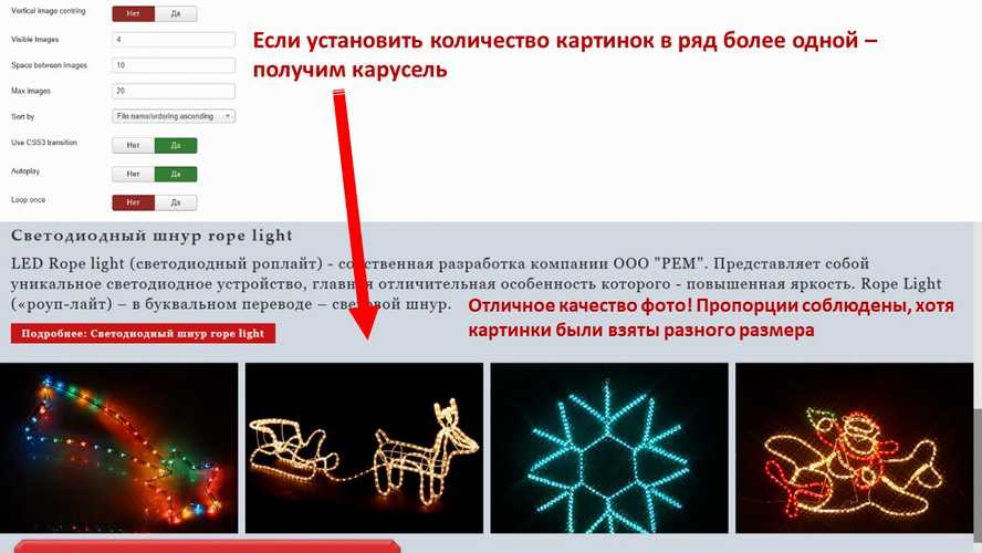 Позволяет изменять размеры слайдера, не влияя на качество изображений (не изменяя параметры картинки). Добавлять описания к слайдам, устанавливать разные эффекты перехода. Выбирать количество отображаемых картинок, создавать слайды, группировать их по категориям. Возможно создание горизонтальной версии слайд-шоу.