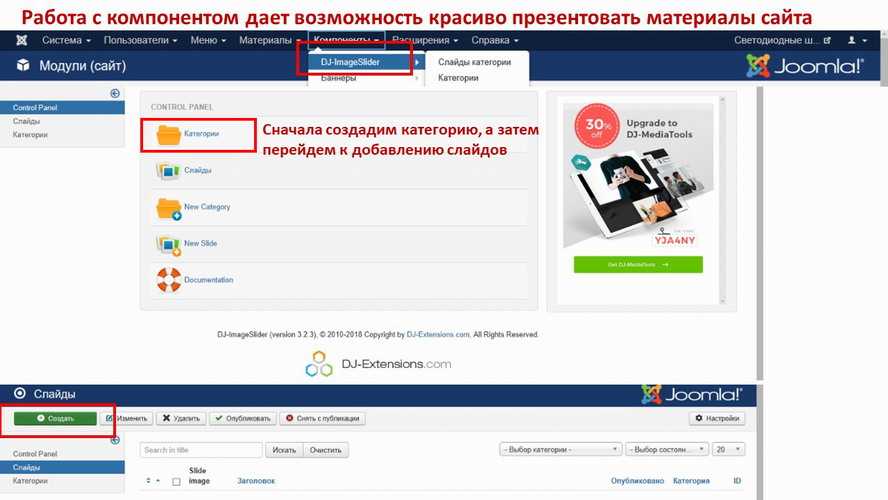 DJ-ImageSlider достоин внимания, поскольку является, пожалуй, одним из самых лучших слайдеров для джумла.