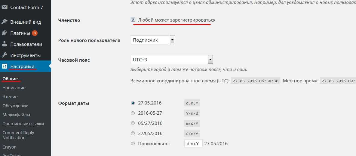 Чтобы включить регистрацию пользователей просто перейдите в раздел «Настройки» => «Общие» и прокрутите вниз к пункту «Членство». Установите галочку рядом с пунктом «Любой может зарегистрироваться».