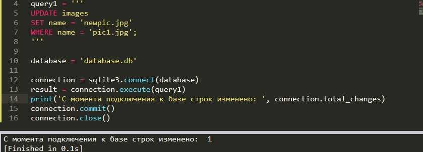 В языке SQL, обновить одно из значений в базе, можно с инструкцией UPDATE. Так мы, за счет чистого SQL, изменим название одной из строк созданных раннее: