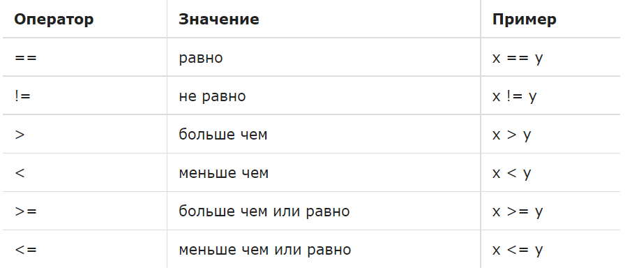 Операторов сравнения в Python 3 не так много, как в других языках программирования, так как нет строгого сравнивания, том уже по умолчанию строгое сравнение, вот они все: