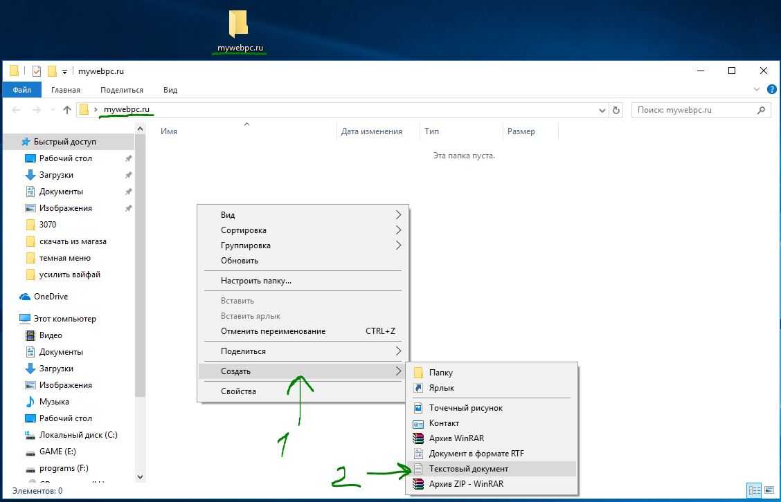 Создайте новый текстовый документ внутри этой папки, щелкнув на пустом месте в созданной папки правой кнопкой мыши. Выберите создать > текстовый документ.