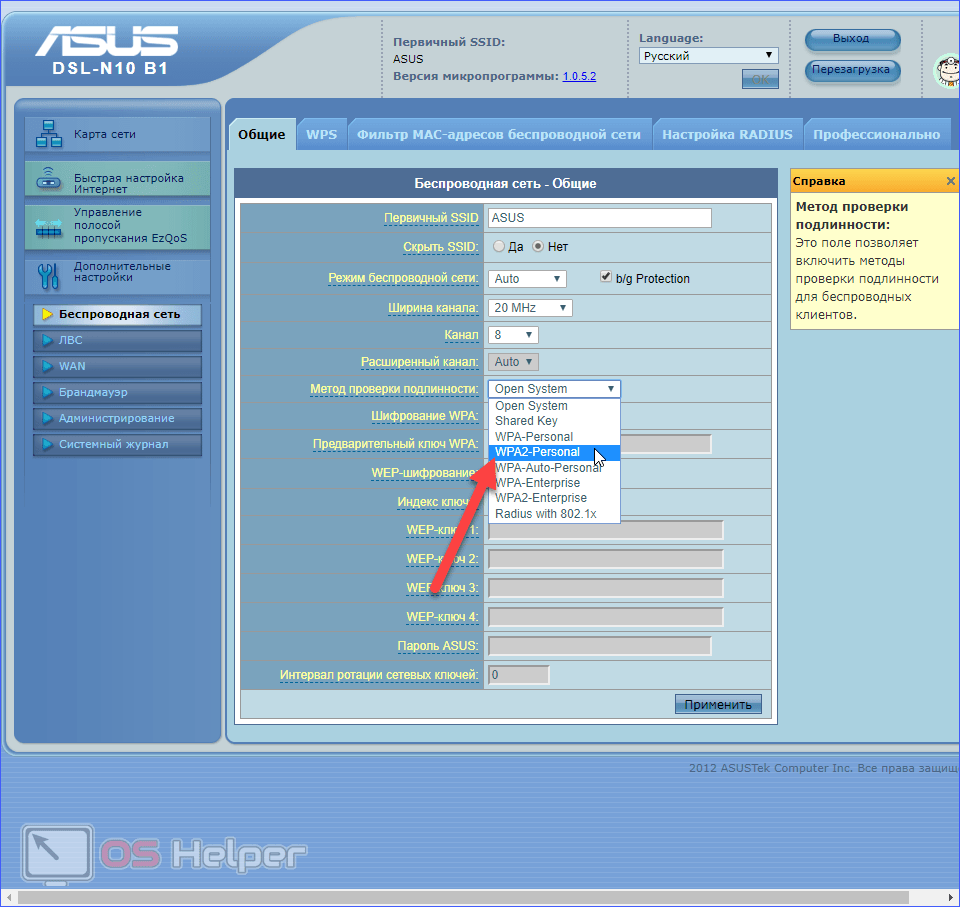 - Теперь откройте вкладку «Беспроводная сеть». Выберите «Метод проверки подлинности» WPA2-Personal.