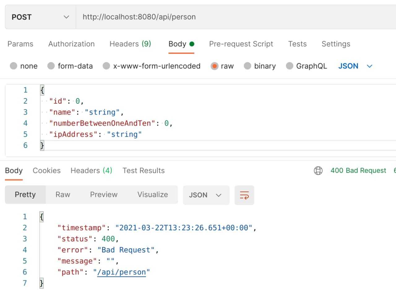 Вызываем наш POST метод и передаем в него не валидные данные.