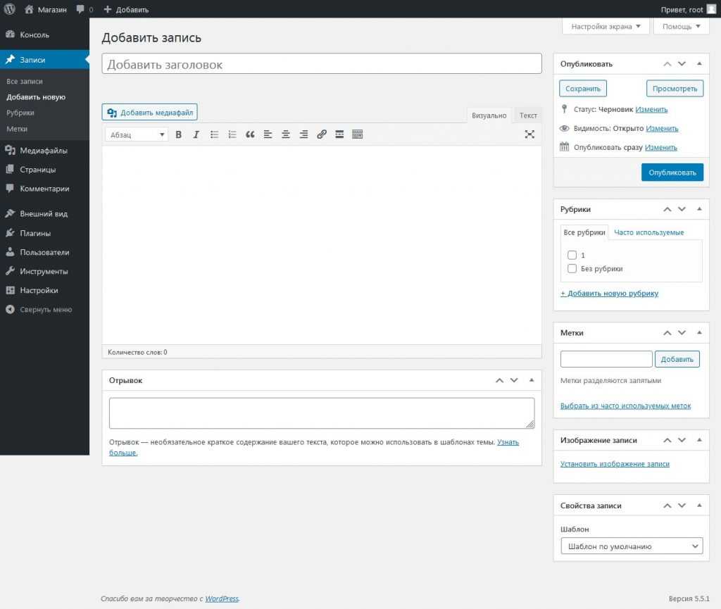 Просто заполните поле заголовка, а затем напишите небольшую тестовую запись в текстовом поле. Это просто для теста, так что вы можете писать все, что хотите. Когда вы закончите, нажмите кнопку «Опубликовать», которая находится справа от окна поля публикации, и готово. Впереди еще много интересной работы! Теперь, когда вы научились публиковать записи, вы можете просматривать их, кликнув по названию своего сайта на панели инструментов в верхней части экрана.