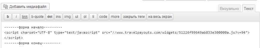 У плагина есть существенный недостаток — разместить его можно только в одном из сайдбаров (т.е. в областях вне контента). Если по какой-то причине такой вариант не подходит вы можете пойти другим путем — вставить код скрипта в текст статьи. Находясь в редакторе статьи, переключитесь из режима «Визуально» в режим «Текст».