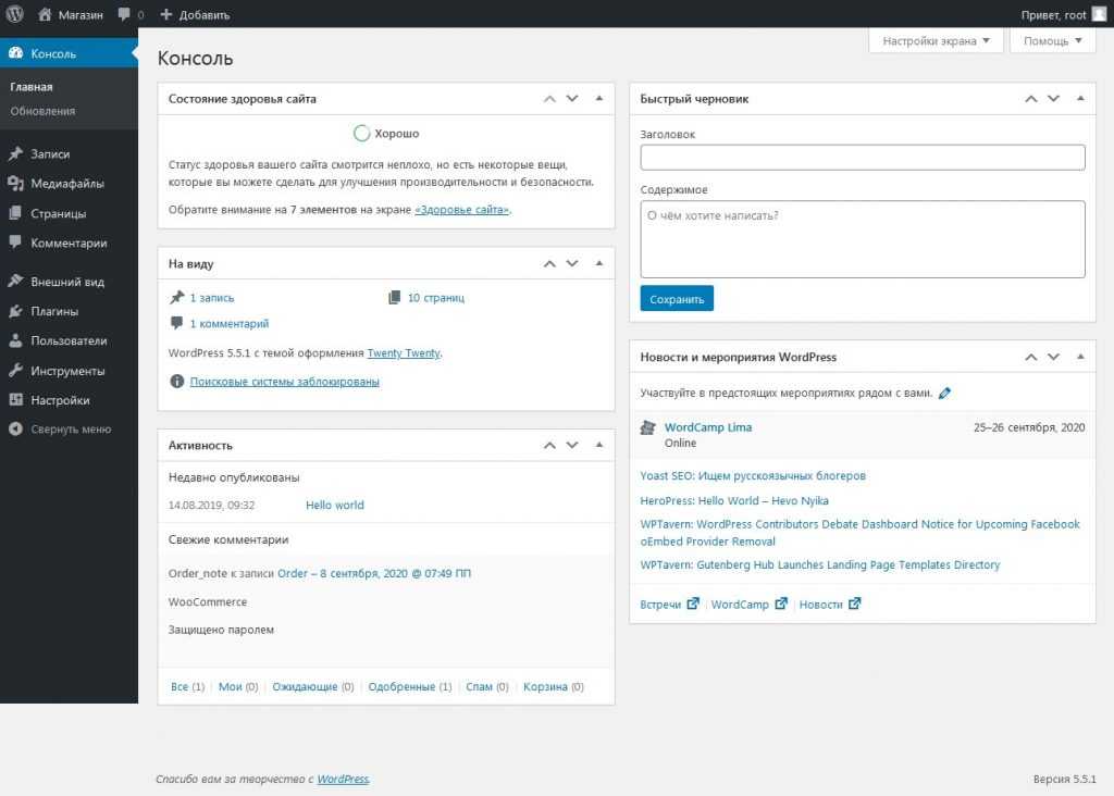 Панель инструментов содержит список последних действий, которые вы выполняли на своем сайте, и помогает находиться в курсе новой и интересной информации из многих ресурсов WordPress.