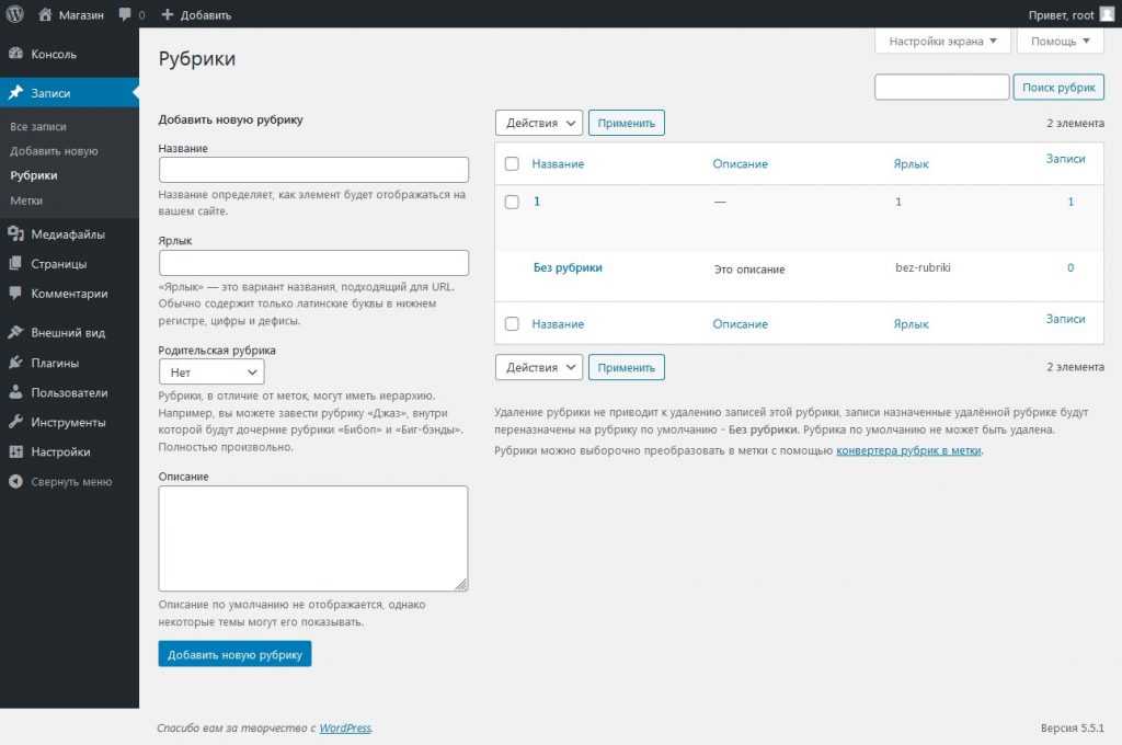 Сообщения обычно хранятся в рубриках и/или метках, поэтому вы можете хранить связанные темы вместе. Прямо сейчас у вас есть только одна рубрика, но скоро потребуется больше. На вкладке в области «Добавить новую рубрику» введите информацию о ней. Продолжайте добавлять свои родительские рубрики вниз по списку. Отложите ввод подрубрик до тех пор, пока не будут введены все основные.