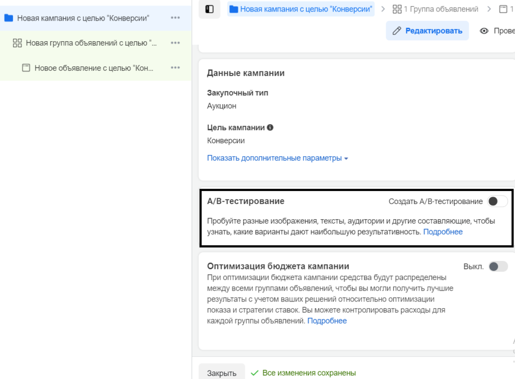 Дальше устанавливаем нужные параметры. Если необходимо – вводим лимит затрат или включаем оптимизацию. A/B тестирование включать не надо. Вместо сплитования у нас будут динамические креативы.