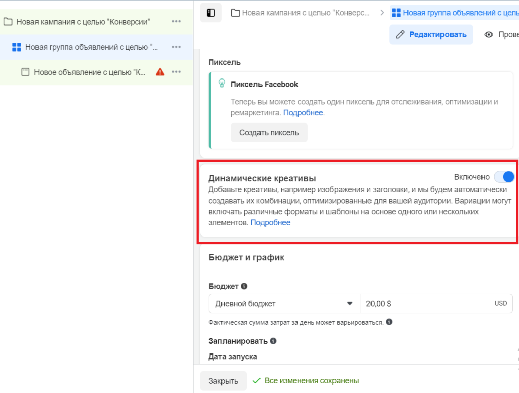 Теперь в меню настройки переходим к «Группа объявлений». Все настраиваем как обычно – таргетинг, дневной бюджет, если надо – создаем пиксель. Но самое главное – включаем «Динамические креативы».