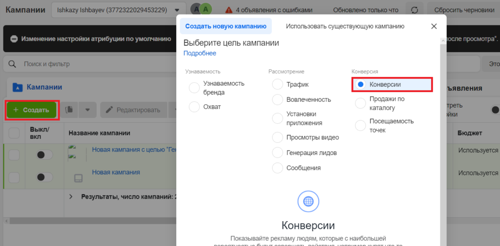 На первом этапе все как обычно: в Ads Manager кликаем «Создать». И выбираем цель кампании. В нашем случае это будут конверсии.