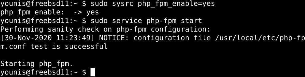 $ sudo sysrc php_fpm_enable=yes $ sudo service php-fpm start