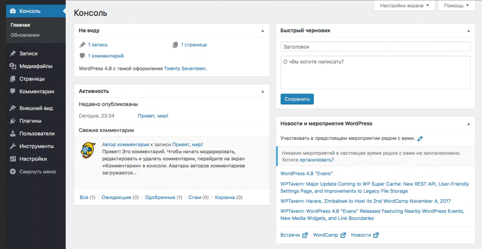 Так выглядит панель управления WP.