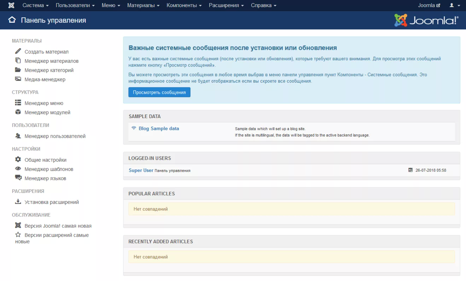 Так выглядит панель управления Joomla.