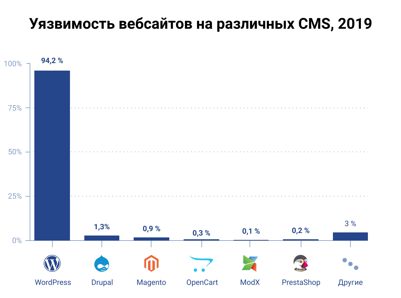 Крайне низкая степень взломоустойчивости. Ну, во-первых, это болезнь всех бесплатных движков. Открытый исходный код позволяет тренироваться в поиске уязвимостей и взломе ресурса даже людям с невысокой квалификацией. Во-вторых, как мы уже отмечали, практически любой сайт требует установки одного или нескольких расширений, каждое из которых в свою очередь потенциально имеет уязвимости.