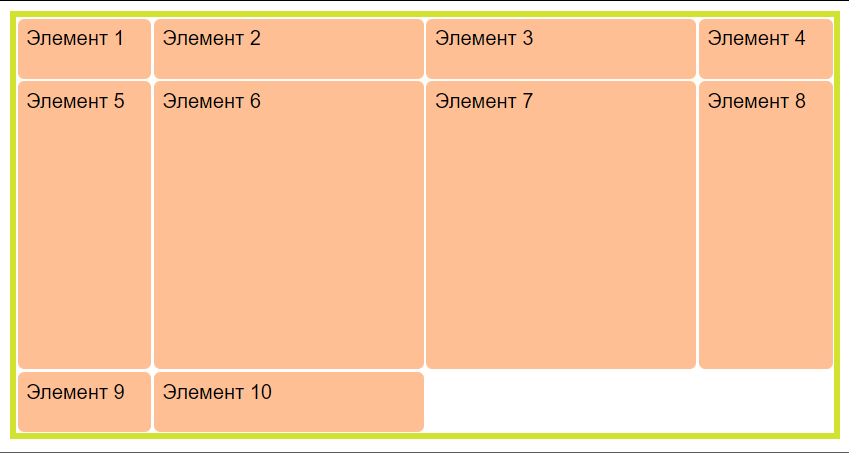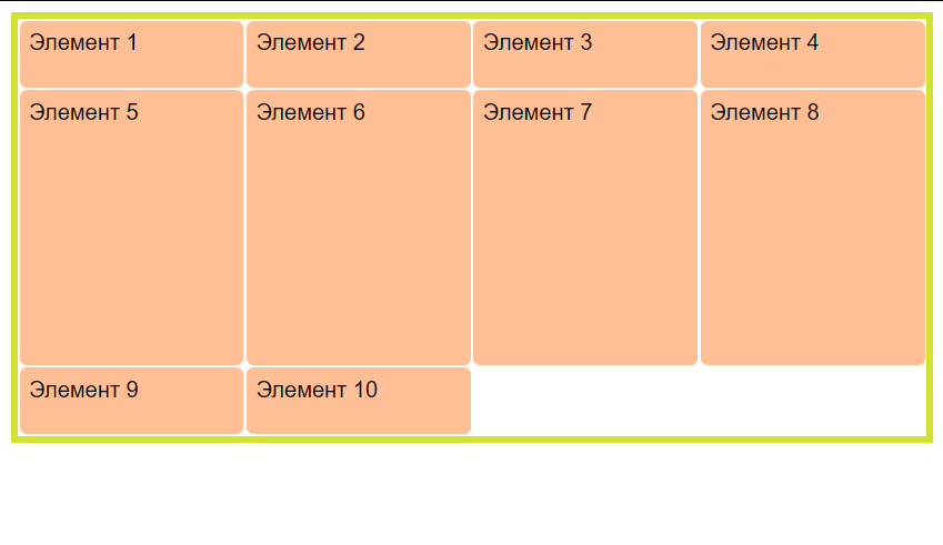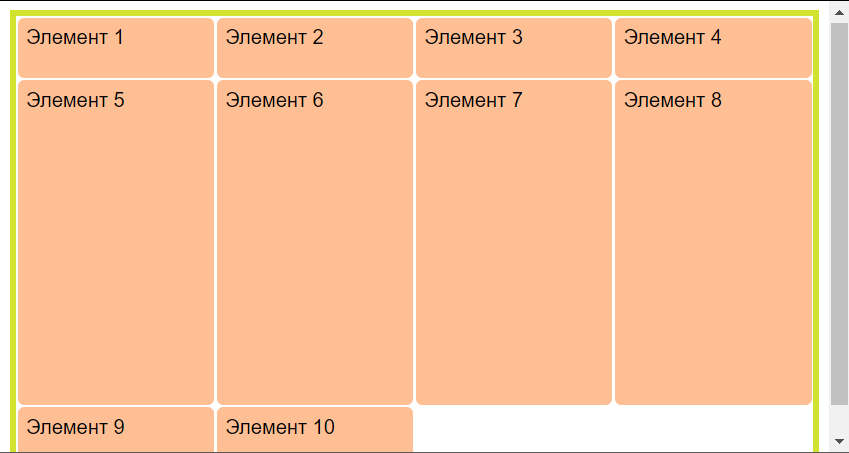 Для элемента с классом , расположенного в первом контейнере с помощью свойства определяем, что элемент будет охватывать две строки и будет завершаться на четвертой строке (целое число соответствует конечной грани элемента в макете сетки).