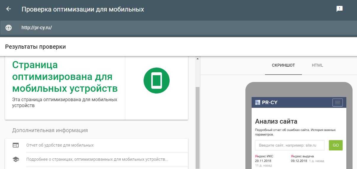 Анализ сайта от PR-CY проверяет ресурс по более 70 параметрам, включая и мобилопригодность. К каждому пункту проверки дает пояснение и совет. Для проверки оптимизации хватит функциональности бесплатной версии.