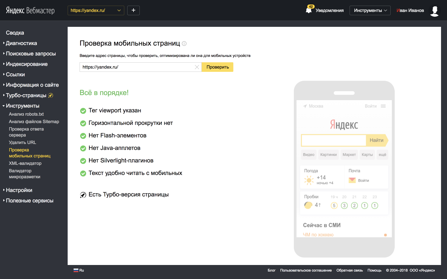 Инструмент от Google, проверяющий оптимизацию сайта для мобильных устройств.