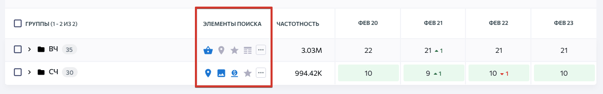 С помощью SE Ranking вы также можете проверить, какие спецэлементы сайт получил в выдаче Google — ведь большинство из них так или иначе связаны с картинками. Для этого анализируйте колонку «Элементы поиска» в таблице «Позиций».