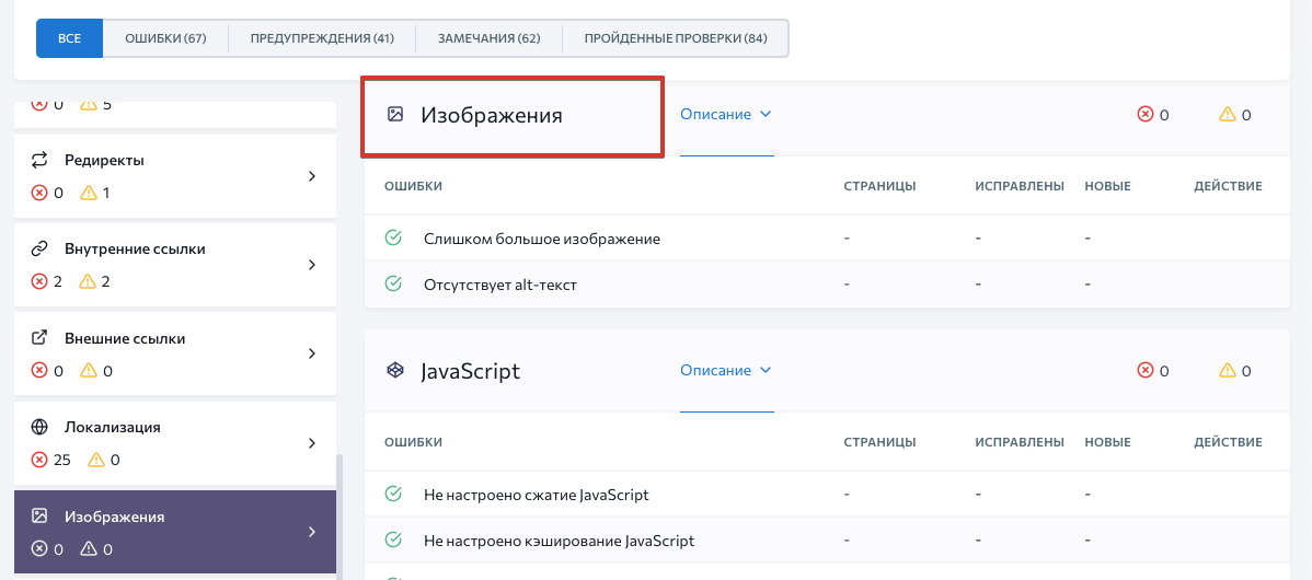 Секция «Изображения» в подразделе «Отчет об ошибках» определит, если на сайте есть картинки слишком большого размера или с незаполненным текстом alt: