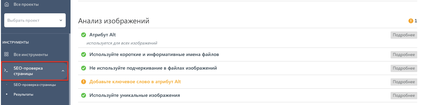 «SEO-проверка страницы» также определяет проблемы с заполнением атрибута alt и имени файла, а также анализирует уникальность изображений: