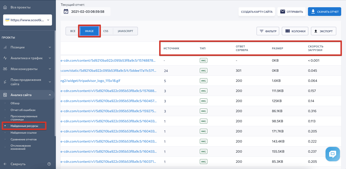 Кроме этого, в «Анализе сайта» есть подраздел «Найденные ресурсы», где можно просмотреть URL-адреса каждого изображения, код ответа сервера, размер и скорость загрузки: