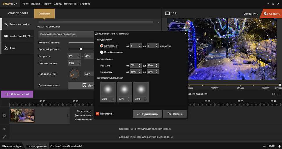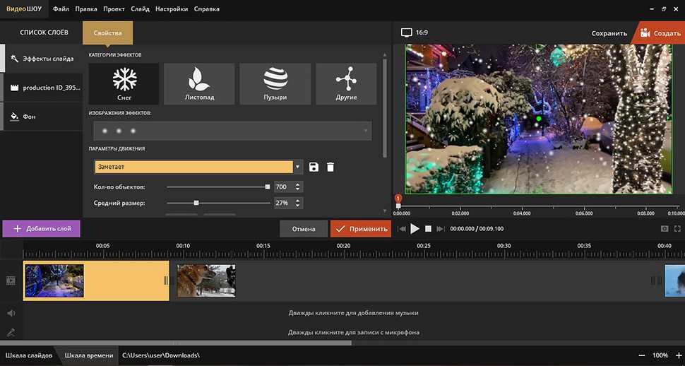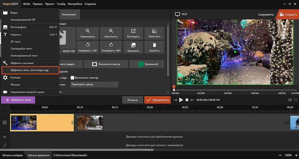ВидеоШОУ предлагает возможность наложить на видео эффект снега, настроив оформление, скорость и траекторию движения снежинок полностью на свой вкус. Для начала загрузите видеофайл в программу и кликните по кнопке «Редактировать слайд» в окне проигрывателя. После этого нажмите «Добавить слой» и выберите «Эффекты снега, листопада и др.».