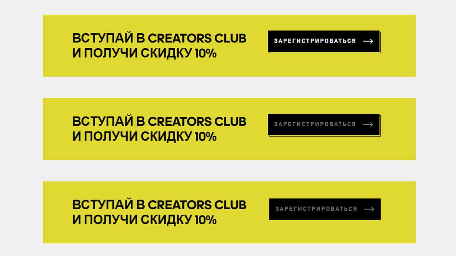 Три состояния кнопки на сайте adidas.ru: нормальное состояние (верхнее), при наведении мыши (среднее) и нажатое (нижнее)Скриншот: adidas.ru