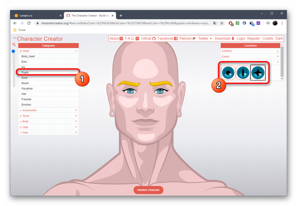 Через отдельную категорию «Pupils» можно задать одну из трех форм зрачка, а также дополнительно выбрать предпочитаемый цвет.