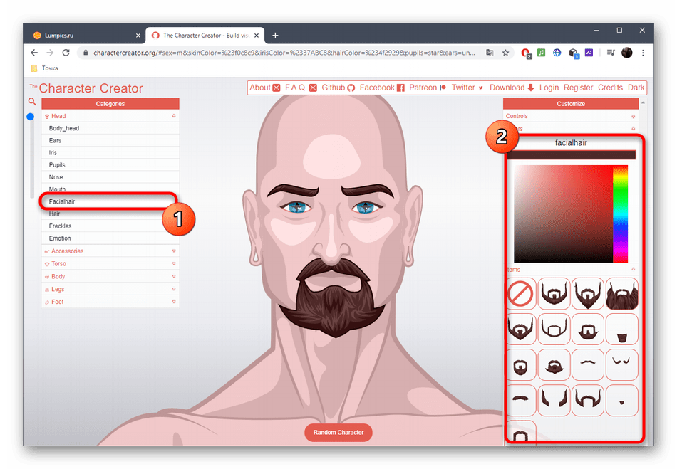 В Character Creator присутствуют самые разные вариации бороды и усы, которые можно посмотреть через «Facialhair». Тут же настраивается цвет и полностью убирается волосяной покров на лице.