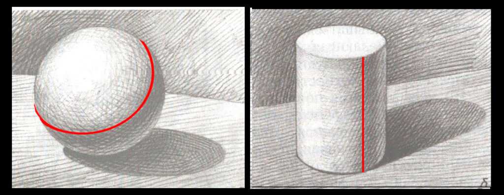 Границы между этими участками ( светом и тенью и.т.д.) проходят по поверхности предмета, а значит, должны соответствовать ее форме. Например, на шаре граница между светом и собственной тенью не может иметь углов, а на боковой поверхности Цилиндра- не может быть дугообразной. Если предмет сложной формы, границы меняют направление вместе с изменением формы поверхности