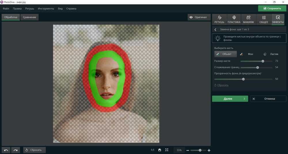 Перейдите в раздел «Эффекты» и выберите функцию «Замена фона». Чтобы вырезать лицо, выделите его с помощью зеленой кисти «Объект». Затем обозначьте фон с помощью красной кисти.