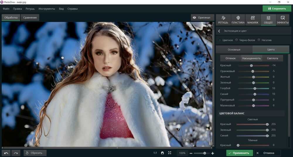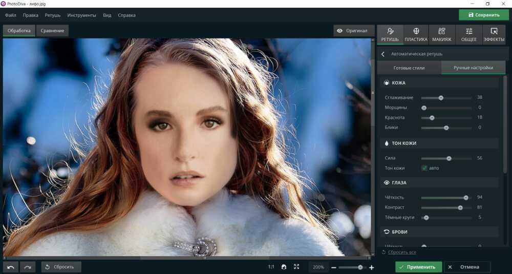 PhotoDiva — удобная программа, предназначенная для ретуши снимков и фотомонтажа. С ее помощью можно скрыть недостатки и улучшить кожу модели, произвести пластику глаз, губ, бровей, носа и фигуры, сделать макияж и в 1 клик преобразить фото благодаря встроенным эффектам.