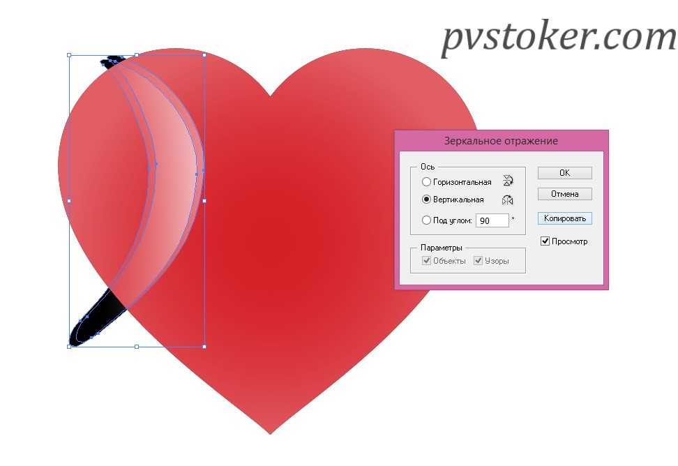 Теперь такие же блики мы создадим на противоположной стороне сердца для этого нам нужно их выделить, используя инструмент Выделение (Selection tool или V) и правой клавишей вызвать подконтекное меню в котором перейти Поворот — Зеркальное отражение. В появившемся окне выбираем Вертикальное и нажимаем кнопку Копировать. Отодвигаем полученную копию блика на другу сторону сердца.