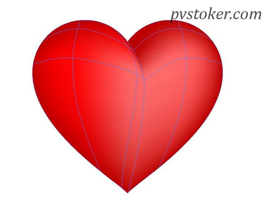Теперь мы разобрались как работать с градиентной сеткой. Дальше что нам нужно — это создать еще парочку опорных точек по бокам и снизу сердца и закрасить их темно красным цветом, а также чуть выше от середины, чтобы иметь возможность закрасить белым цветом — наши блики. Результат вы можете видеть снизу.