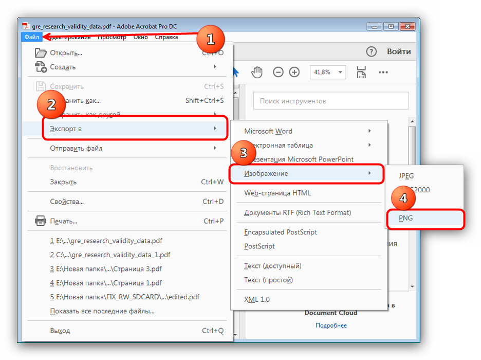 Далее снова используйте пункт «Файл», но на этот раз выберите вариант «Экспорт в…», затем опцию «Изображение» и в самом конце формат «PNG».