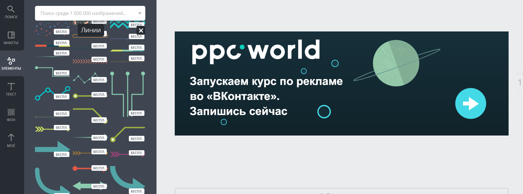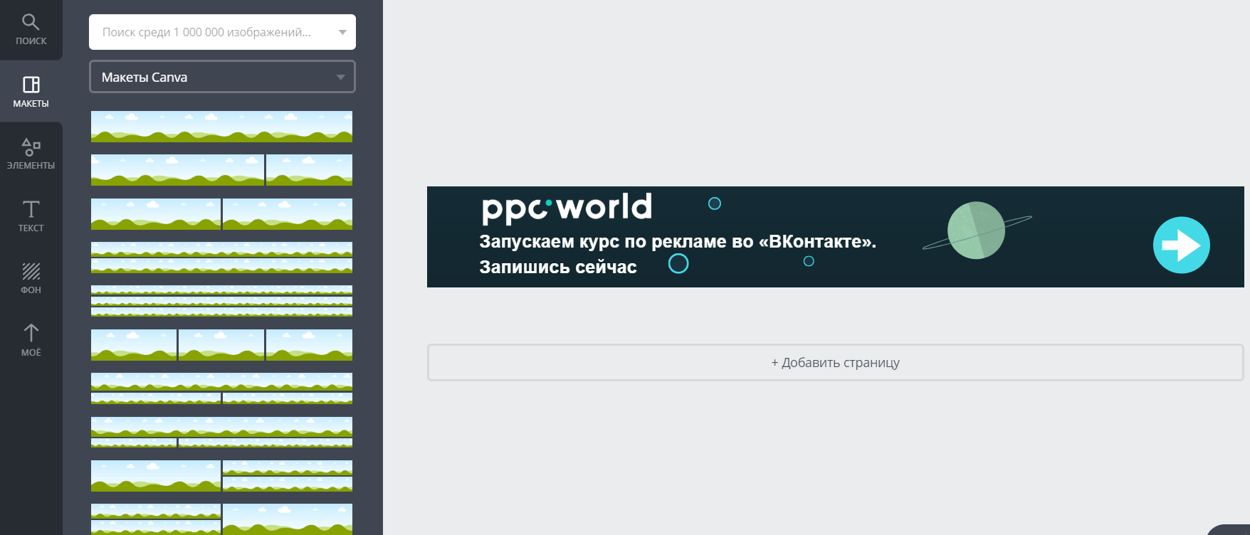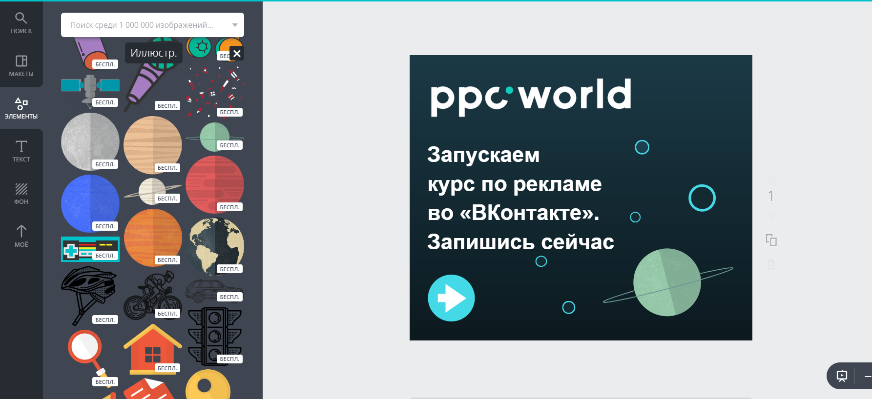 Осталось добавить несколько простых декоративных элементов. В Canva нет возможности свободно выделить часть изображения, обрезать и вставить элемент в баннер, как в более сложных и продвинутых фоторедакторах. Если нужно добавить на баннер элемент изображения, придется обрезать его в другом графическом редакторе, сохранить и загрузить в медиатеку Canva. Зато в Canva большая библиотека фонов и иллюстраций. Так как дизайн нашего баннера простой, можно выбрать что-то из иллюстраций в библиотеке сервиса.